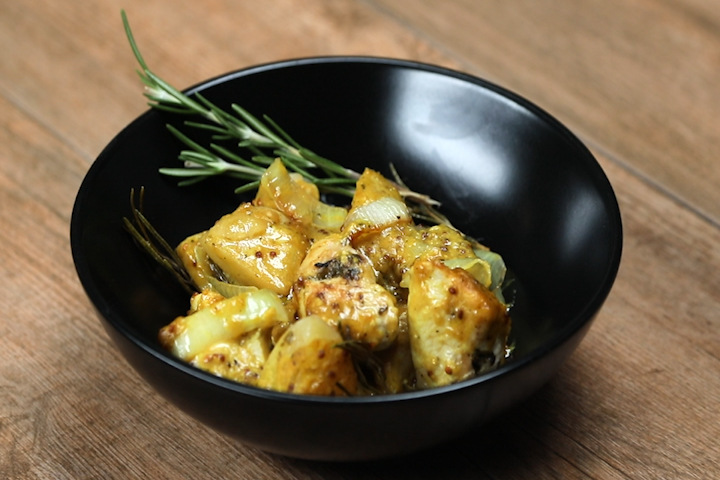 • تُسكب الصلصة فوق الدجاج والبطاطس ويُضاف إكليل الجبل.
